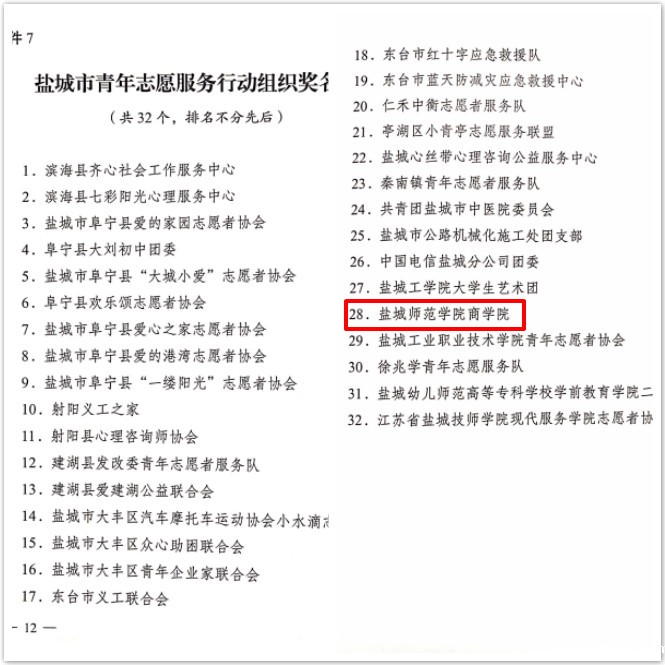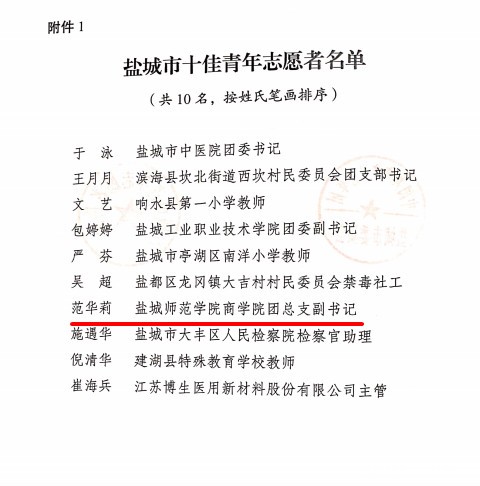 坐标网讯 日前,共青团盐城市委、市青年志愿者协会共同下发《关于公布2019年度盐城市优秀青年志愿者、志愿服务项目、志愿服务行动组织奖、志愿服务事业贡献奖、志愿服务新闻宣传奖的通知》,商学院团总支副书记范华莉获“盐城市十佳青年志愿者”、商学院获“2019年盐城市青年志愿服务行动组织奖”。