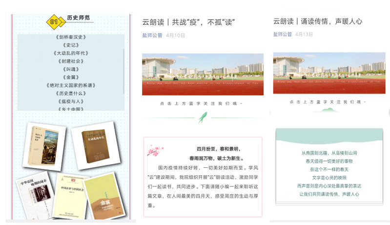 悦享“云读书”,提升学子精神境界。结合不同专业特点,专业老师列出学科“云读书”必读书单,形成师生“共读一本好书”的学院特色,让学生在“悦”读中赋能;在全院范围内开展“云诵读”活动,通过有声语言感悟战“疫”中的先进典型和励志故事,培养学生的使命感和责任意识;建立线上读书小组,通过老师领读,积极引导学生制定小组读书计划,交流读书心得,营造沉浸式读书学习氛围,打造线上学习共同体。