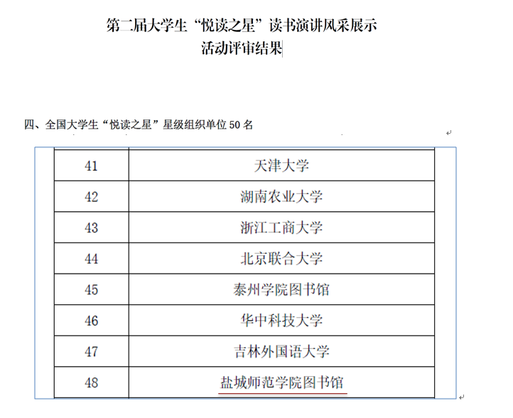 坐标网讯 在近日举行的第二届全国大学生“悦读之星”读书演讲风采展示活动评审中,我校荣获星级组织单位。本次活动由中国图书馆学会阅读推广委员会举办,武汉大学图书馆、青岛科技大学图书馆承办,全国共有50家高校获此殊荣。