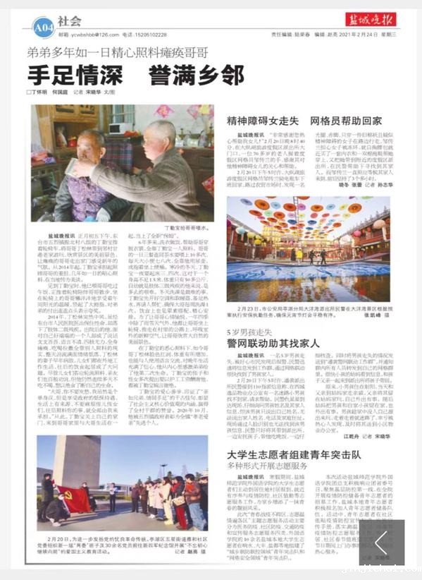 坐标网讯 2月24日,《盐城晚报》A04版报道了外国语学院大学生志愿者组建青年突击队 以多种形式开展志愿服务活动