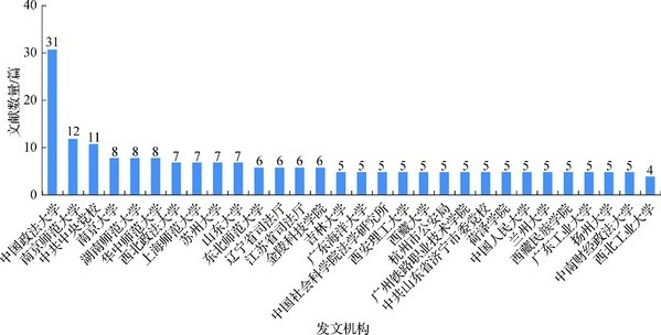 在对文献作者及发文机构信息进行分析的基础上,本研究绘制了法治文化研究作者合作网络知识图谱和发文机构情况,如图2、图3所示。作者合作网络知识图谱直观反映了这些作者的观点具有一致性或某种相似性,也表明这些作者大多是通过合作完成相关研究的,比如我国法治文化建设分析、社会主义新农村法治文化建设等均由较为稳定的作者群合作完成[1]。但从总体上来看,法治文化研究领域的作者合作并不占多数,没有形成长期稳定的研究团队。通过对发文机构情况的分析可以看出,在法治文化领域发文量较大的机构主要有中国政法大学(31篇)、南京师范大学(12篇)、中共中央党校(11篇)、南京大学(8篇)、湖南师范大学(8篇)、华中师范大学(8篇)、西北政法大学(7篇)、上海师范大学(7篇)、苏州大学(7篇)、山东大学(7篇)等。发文量较高的机构主要是国内政法类及师范类高校,在前十位发文机构中有6家,其发文量占比近70%。