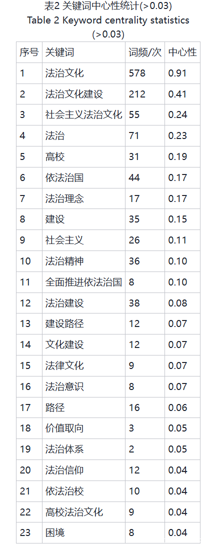 从作者学科背景方面来看,作者学科背景呈现出多元化的特点,发文作者既有法学、哲学、文学等专业背景,也有教育学、历史学、管理学、教育学等学科背景;从作者合作关系方面来看,从事法治文化研究的作者比较分散,成果大多不集中,系统性不强,所以难以形成稳定的研究合作关系和较为重量级的研究成果,没有形成核心作者群,学术队伍建设有待进一步加强。