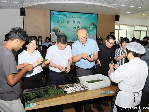 活动现场,师生们专注投入粽子制作全过程。青翠箬叶在指尖翻折成锥形,雪白糯米与赤红蜜枣被精准填入,细韧棉线缠绕出棱角分明的四角粽。留学生们在示范指导下逐步掌握裹叶、填料、捆扎等技法,通过亲手实践领悟端午食俗背后的工艺智慧与文化内涵。箬叶清香弥漫间,传统节庆的仪式感浸润人心。