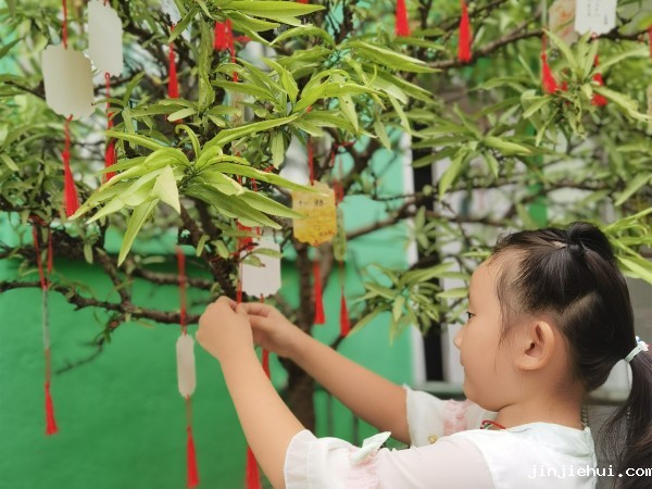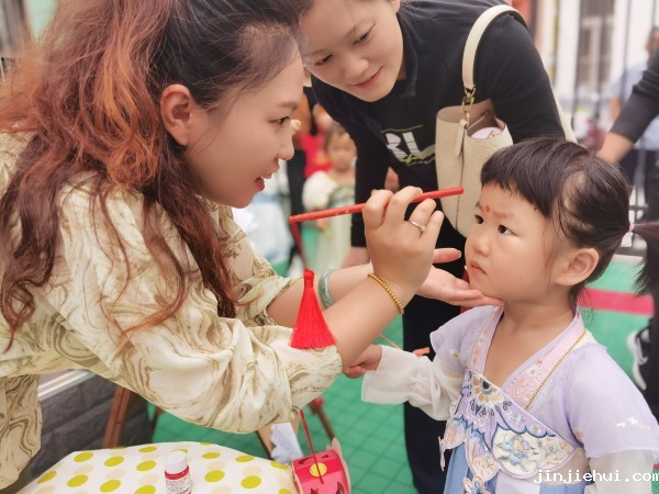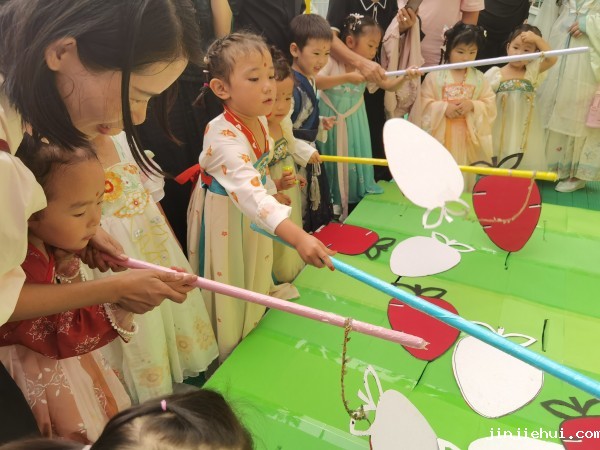 伴随着舒缓、优美的音乐声,游园会正式开始。孩子们身着汉服,和家长手拉手走进幼儿园大门。从点朱砂、挂灯笼、写心愿、挂许愿卡到制作月饼、玩“月兔拔萝卜”“投壶”“玉兔套圈圈”等游戏,再到全园师生家长聚在一起话中秋、品美食,每一个环节大家都不落下。在浓浓的节日氛围里,不论大人还是孩子,都是意犹未尽,“月”玩“月”开心。