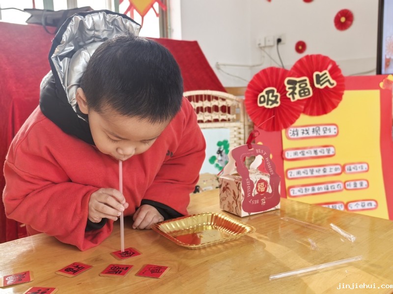 趣味游戏 福趣多多 游艺室里笑声多,家长和孩子来比赛:吸“福”字、钓“福”盒,拿到奖品时,孩子们欢呼雀跃,立即和同伴分享起来:“我的奖品是小海豚”“我的大礼盒里有妙脆角和棒棒糖”……