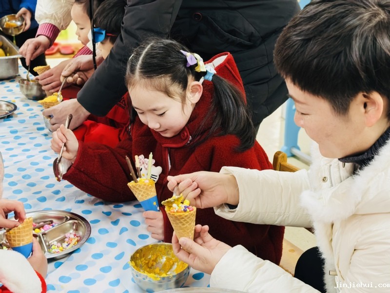 美味甜筒 一饱口福 美食屋里很热闹,大家将熟红薯压成泥,再一勺一勺装进甜筒里,最后加点彩虹豆、饼干条等装饰一下。制作完成的美味红薯冰淇淋,让家长和孩子一饱口福。
