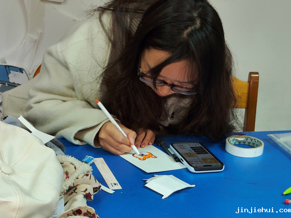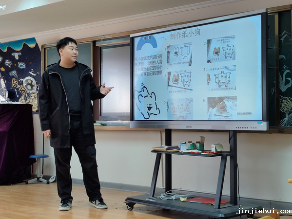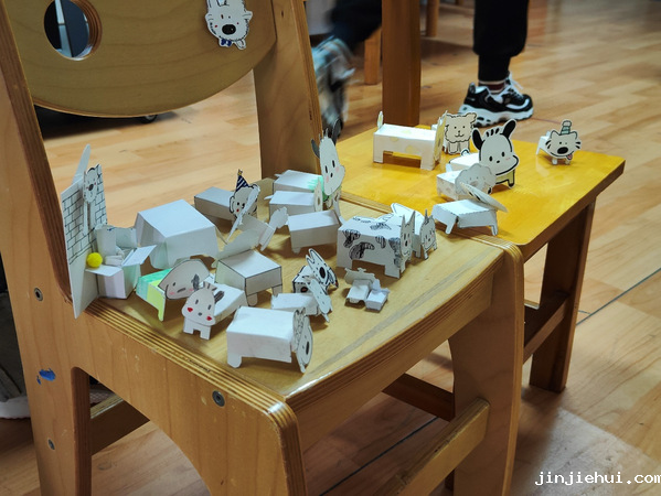 活动伊始,主持人向大家介绍了纸小狗的制作流程——首先画出小狗的头和身体,接着上色,然后进行折叠,最后将小狗的头和身体粘到一起,纸小狗就完成了。听完讲解,手工创作区的同学们十分热情,充分发挥自己的想象力和动手能力,纸张在指尖或灵动跳跃,或精心折叠,或巧妙装饰……一只只独一无二的纸小狗纷纷诞生,琳琅满目的纸小狗作品中,有的萌态可掬,有的创意十足,真是让人“眼前一亮又一亮”。