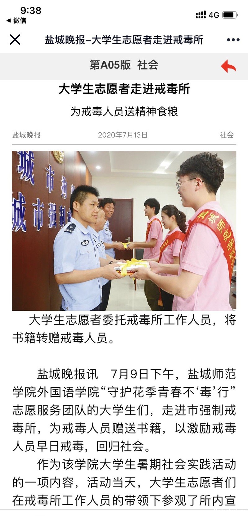 坐标网讯 《盐城晚报》7月13日报道kaiyun手机网页版登录入口外国语学院志愿者走进戒毒所为戒毒人员送精神食粮