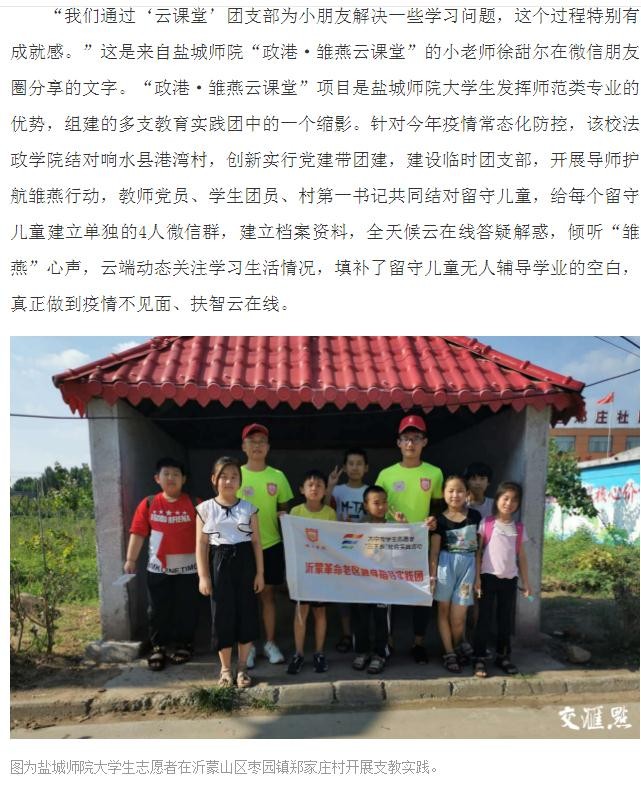 坐标网讯 9月8日,《交汇点》新闻客户端发表通讯报道《青春挥洒田野!这个暑假,江苏大学生用足迹回答时代之问》,其中报道我校暑期社会实践项目——“政港·雏燕云课堂”。这是我校大学生发挥师范类专业的优势,组建的多支教育实践团中的一个缩影。