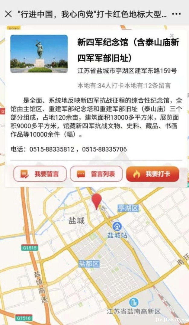 编者按为庆祝中国共产党成立100周年,由江苏省委网信办指导,新江苏客户端、中国江苏网、“学习强国”江苏学习平台特别策划推出“行进中国 我心向党——打卡红色地标”大型融媒体行动。行动通过寻访、瞻仰有代表性的纪念馆、纪念地、革命圣地、烈士陵园等红色地标,回顾百年党史,重温革命精神,传承红色基因,汇成“我心向党”的宏大交响。