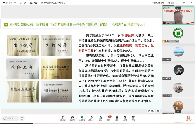 药学院将以此次线上家长会为起点,持续推进新生入学教育,通过开展入学适应讲座、生涯规划指导、心理健康与安全教育等活动,帮助新生平稳适应大学学习生活。