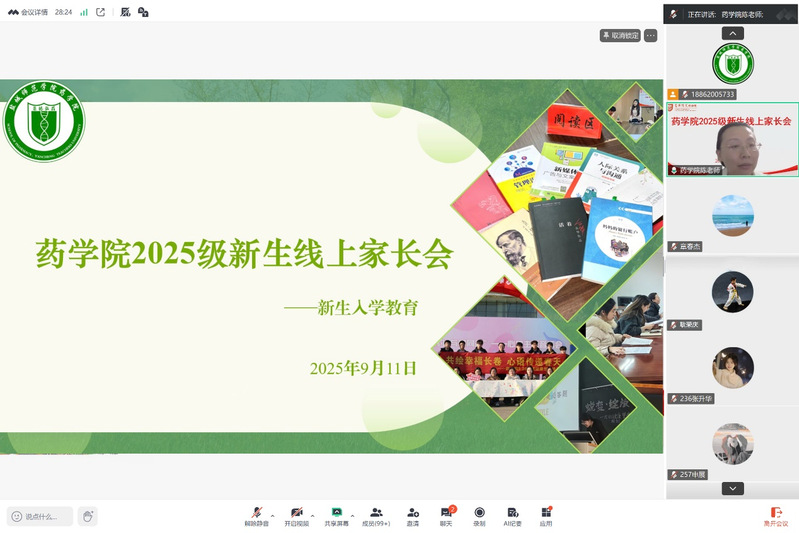 9月11日晚,药学院召开2025级新生线上家长会。学院党总支书记章春杰,党总支副书记、院长耿荣庆,新生辅导员及全体新生、家长参加会议。党总支副书记陈倩倩主持会议。