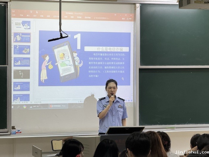 讲座中,李警官以“人这一生 都在为认知买单”为题,结合真实案例,向同学们深入讲解电信诈骗的概念,重点揭露“冒充熟人诈骗”“刷单诈骗”“冒充客服诈骗”等诈骗形式并用案例详细说明。她提醒同学们特别注意“不闻其声,不经核实,不许转账”“你是否清白,不需要用钱来证明”等事项,引发大家的共鸣与思考。