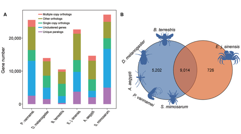 唐院长团队对甲壳动物中华绒螯蟹、三疣梭子蟹、凡纳滨对虾,昆虫埃及伊蚊、黑腹果蝇、偏瞳蔽眼蝶、蜘蛛等7种节肢动物基因家系展开进一步研究发现,它们共有15503个基因家系,其中8832个基因家系为共有家系,328个和544个基因家系分别唯一存在于三疣梭子蟹和中华绒螯蟹中。