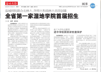 据介绍,湿地学院教师作为学科带头人的“动物学”、“生物学”和“生物工程”先后被评为江苏省重点建设学科;获得江苏省教学成果奖一等奖1项,二等奖2项;江苏省高等学校精品课程一门;指导学生获得第七届“挑战杯”中国大学生创业计划竞赛金奖,指导学生参加全国性专业、学科、技能竞赛获奖15项,江苏省优秀本科毕业论文一等奖1项。学院分别在盐城湿地珍禽国家级自然保护区和江苏省大丰麋鹿国家级自然保护区各建有可同时容纳70人生活学习的野外实习基地。