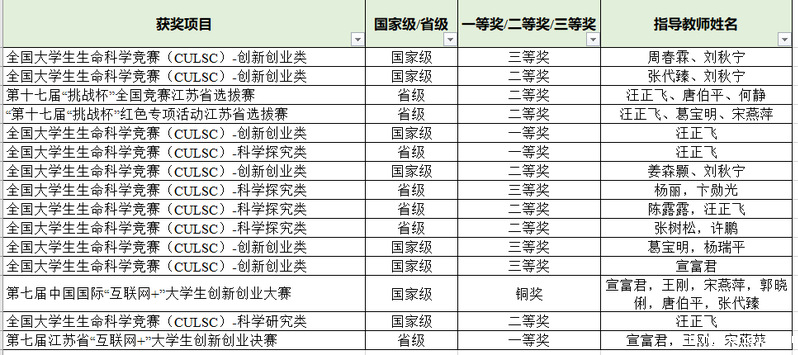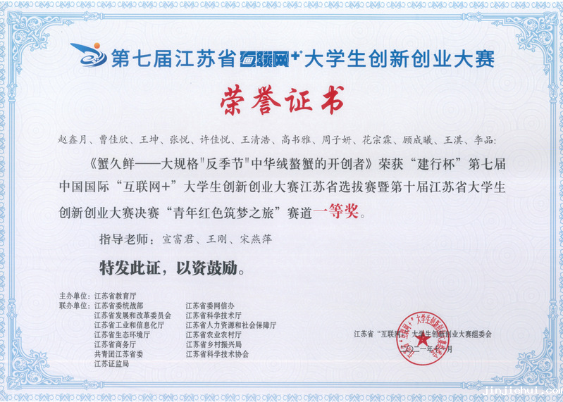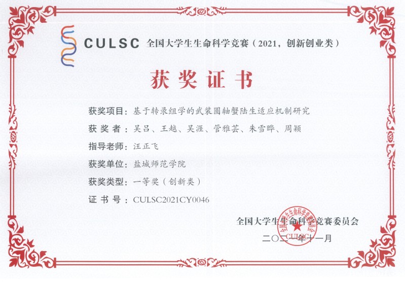 宣富君老师指导的“蟹久鲜-大规格反季节中华绒螯蟹的开创者”荣获第七届中国国际“互联网+”大学生创新创业大赛铜奖;汪正飞老师指导的“基于转录组学的武装圆轴蟹陆生适应机制研究”荣获全国大学生生命科学竞赛(CULSC-创新创业类全国一等奖。