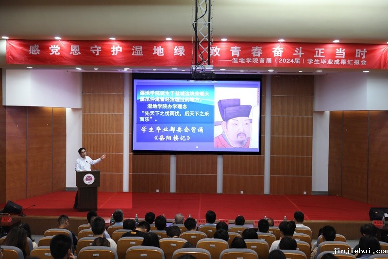 湿地学院首届本科生毕业典礼的一个重要组成部分是毕业成果汇报。湿地学院创院院长唐伯平教授汇报了学院成立