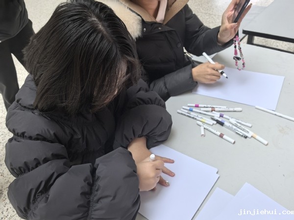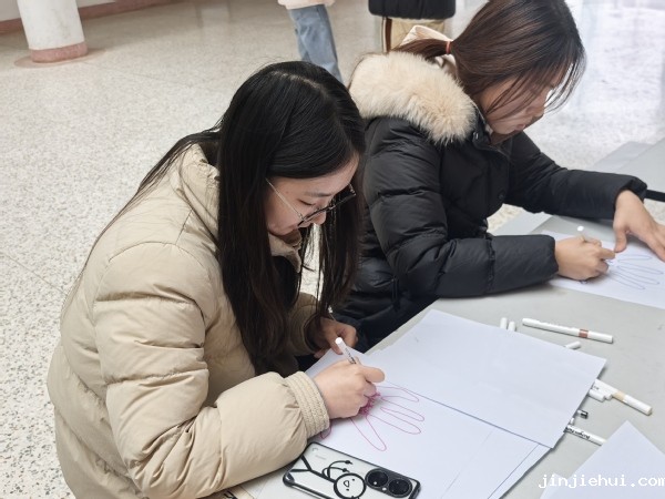 活动伊始,参与者们敛神静气,专注于KT板之上,精心勾勒出自己手掌的轮廓。其间,诸多同学坦言,仿若能真切触碰到与内心深处的隐秘联结,感知到自身潜藏的独特力量。继而,他们执起彩笔,于手掌轮廓内工工整整地写下一句句激昂的人生格言,那些文字仿佛也被赋予了力量,熠熠生辉。
