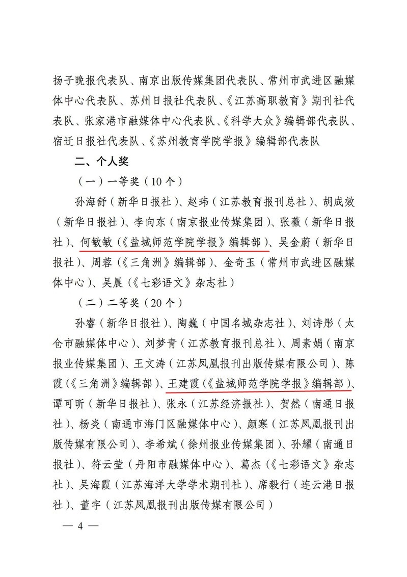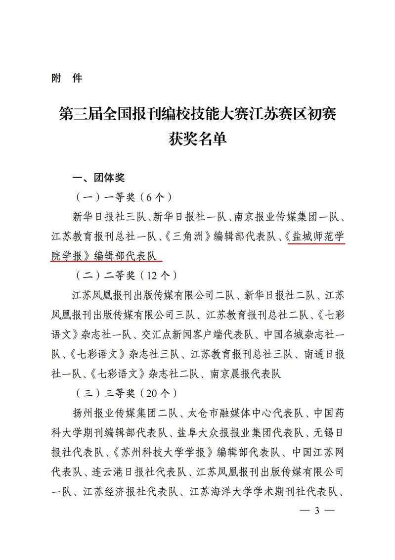 11月24日,学报编辑部接到省新闻出版局下发的《关于第三届全国报刊编校技能大赛江苏赛区初赛获奖集体和个人的通报》(苏新出发〔2023〕16号),在10月28日由省新闻出版局、省期刊协会、省报业协会联合举办的第三届全国报刊编校技能大赛江苏赛区初赛中,学报编辑部代表队(成员:朱根、王建霞、何敏敏)荣获团体一等奖,也是团体一等奖代表队中唯一一支高校学报代表队。