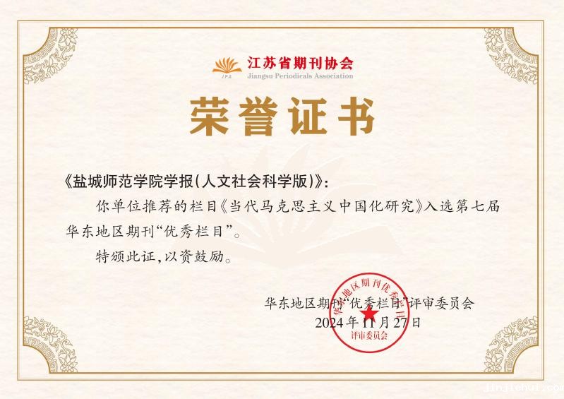 今年8月,华东地区期刊协会联盟组织开展了第七届华东地区期刊“优秀栏目”推荐活动,将期刊分为社科学术、科技学术、非学术三大类,从政治标准、质量标准、栏目的长效性三个方面对期刊栏目进行省(市)初审和华东地区期刊优秀栏目评审委员会终审两级评审。经过专家和评委会根据相关评审细则严格评选,我刊“当代马克思主义中国化研究”栏目成功入选华东地区期刊“优秀栏目”。