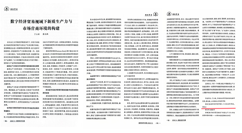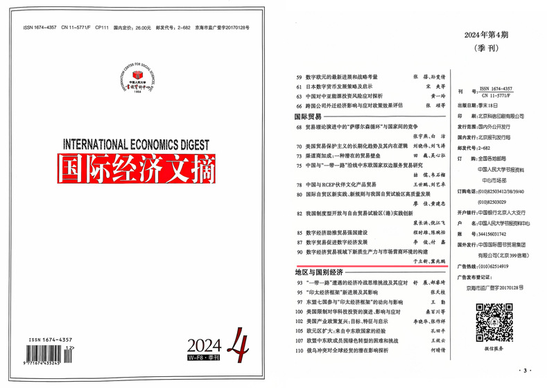 近日,学报编辑部从人大复印资料中心获悉,学报2024年第4期刊发的中国社会科学院财经战略研究院于立新研究员等的《数字经济贸易视域下新质生产力与市场营商环境的构建》一文被人大复印资料《国际经济文摘》第4期转载,实现学报近几年人大复印转载零的突破。
