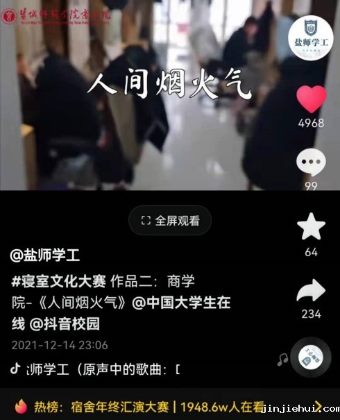 比赛现场共选出3个优秀短视频作品进入“盐师学工”抖音平台线上点赞环节。值得一提的是,在不到两天的线上点赞环节中,3个短视频作品共获得40.6万余次播放量和近10000次点赞量。其中,来自商学院3B111宿舍的短视频作品《人间烟火气》成功入围抖音平台“宿舍年终汇演大赛”热榜榜单。