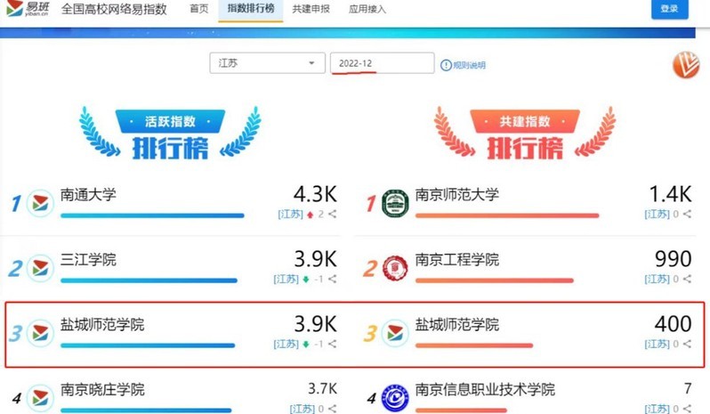 日前,教育部易班发展中心公布了2022年12月全国高校网络易指数排行,分别对所有共建高校的活跃指数、共建指数进行了综合评定排行。我校在此次排行中位列前茅,活跃指数和共建指数都获全省第3名。一直以来学校高度重视“易班”建设工作,成立工作专班、强化队伍建设、设立专项资金、保障硬件设施、加强软件建设、开展系列活动,积极建设网络文化、巩固网络阵地。