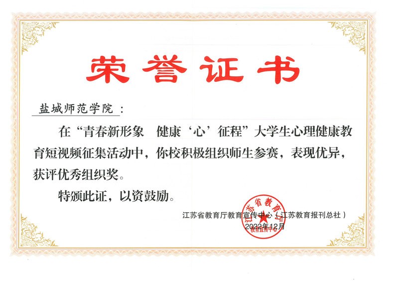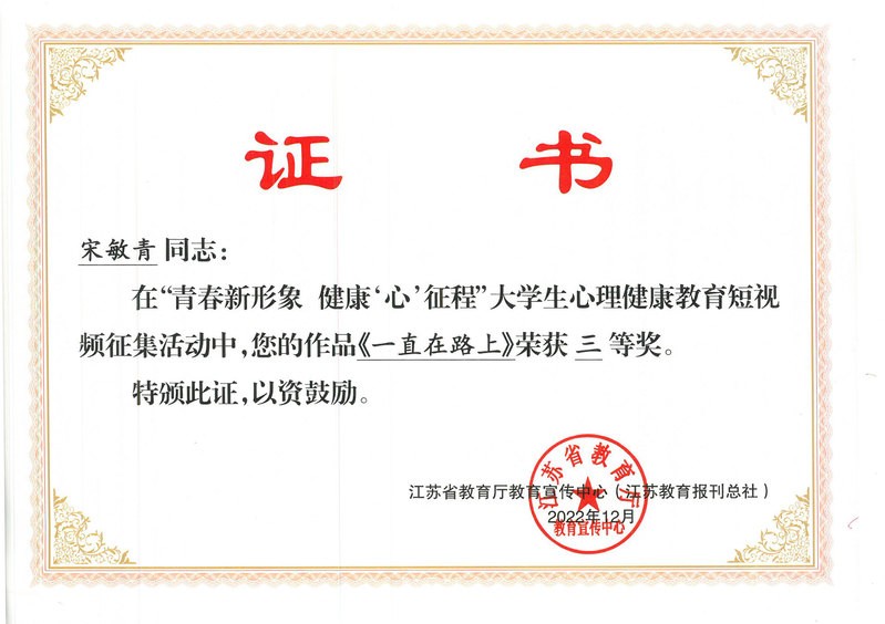 近日,由省教育厅教育宣传中心(江苏教育报刊总社)主办的“青春新形象 健康‘心’征程”大学生心理健康教育短视频征集活动评选结果公布。我校获“优秀组织奖”,据悉全省获奖学校仅二十所,同时法政学院学生宋敏青的作品《一直在路上》也获佳绩。
