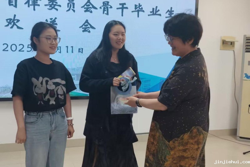 李健明部长在总结发言中充分肯定学生自律委员会骨干的奉献与成长,并重点强调校学生自律委员会的三大精神内核—“以身作则、将心比心、团结协作”。她勉励毕业生:“无论走到哪里,盐师永远是你们的家,期待你们常回来看看。”最后,她携全体老师向毕业生致以最真挚的祝福,亲手为毕业生们送上暖心精美纪念品。
