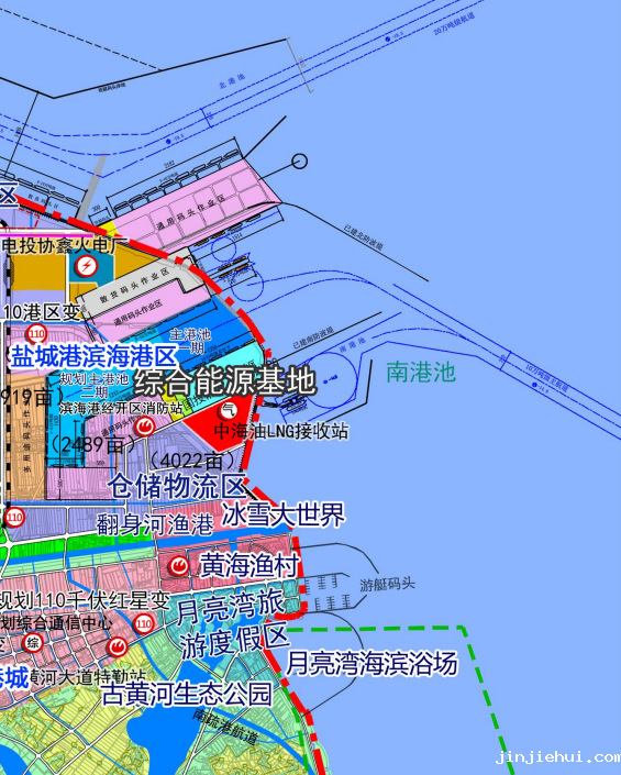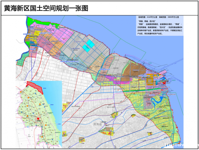 黄海新区陆域范围616 平方公里,海域范围3800平方公里。总体布局为“两港、两城、四片区”空间格局。